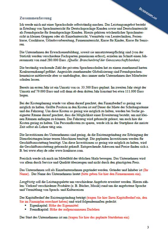 sämtliche Teilaspekte deines Businessplans wurden bereits branchenspezifisch vorformuliert